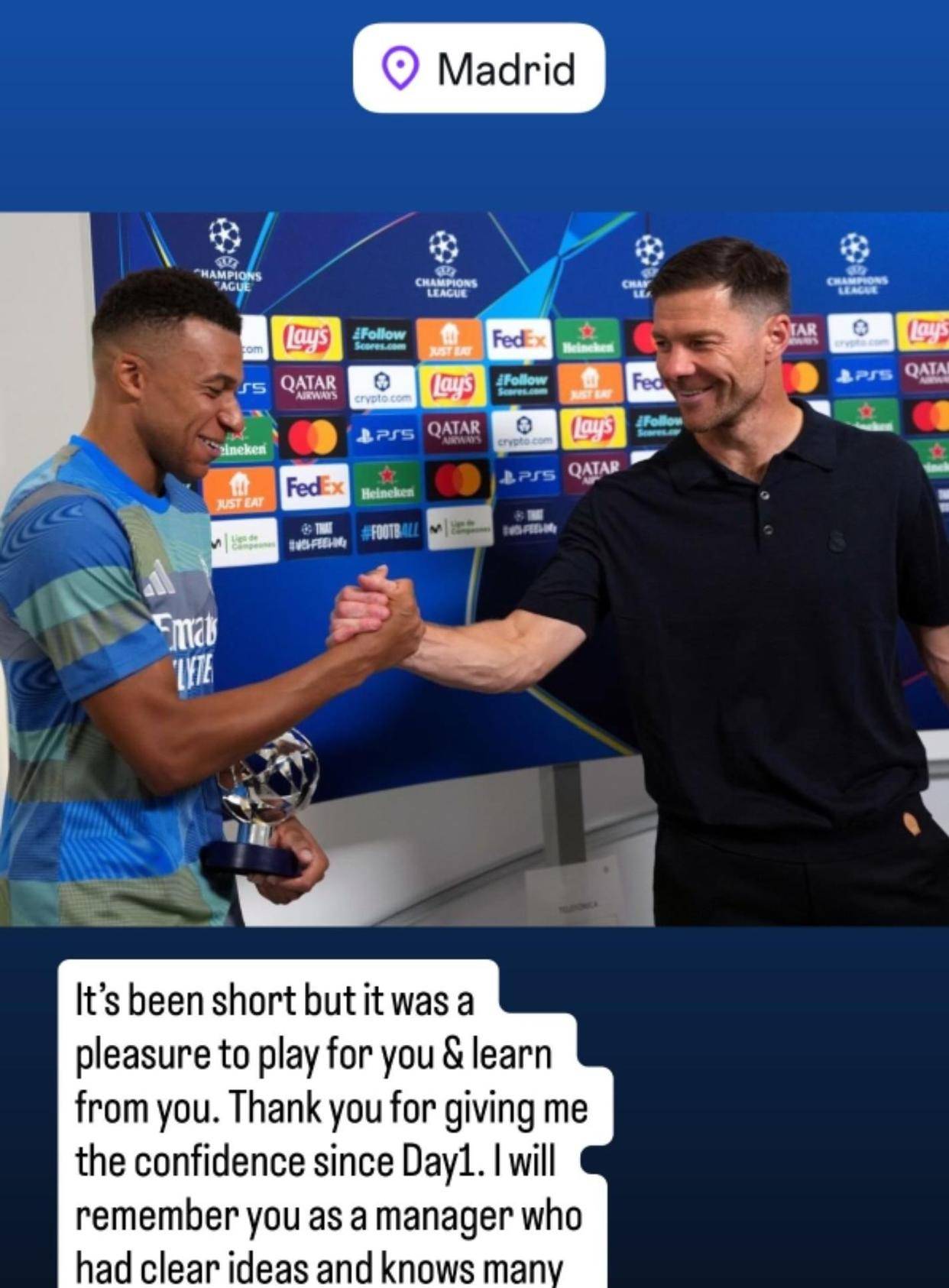 37分钟后,姆巴佩更新了社交媒体。他发布了那张与阿隆索击掌的合影,并用法语和西班牙语双语写道:“教练,为你效力,尽管短暂,却是我的荣幸。祝您未来一切顺利。”这条动态被迅速解读为一种姿态,既是对外界关于他们不和传闻的回应,也是一种职业性的告别。
